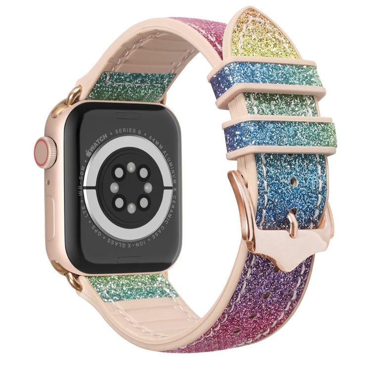 Dieses glänzende Glitzer-Uhrenarmband ist die perfekte Ersatzlösung für Ihre Apple Watch Modelle, einschließlich Series 9, 8, 7, SE und viele mehr. Hergestellt aus Silikonmaterial, das mit PU-Leder überzogen ist, bietet es ein stilvolles Design und lässt sich durch das mehrere Löcher-Design einfach anpassen. Der klassische Dornverschluss sorgt für ein bequemes Tragegefühl und ermöglicht ein leichtes An- und Ablegen.