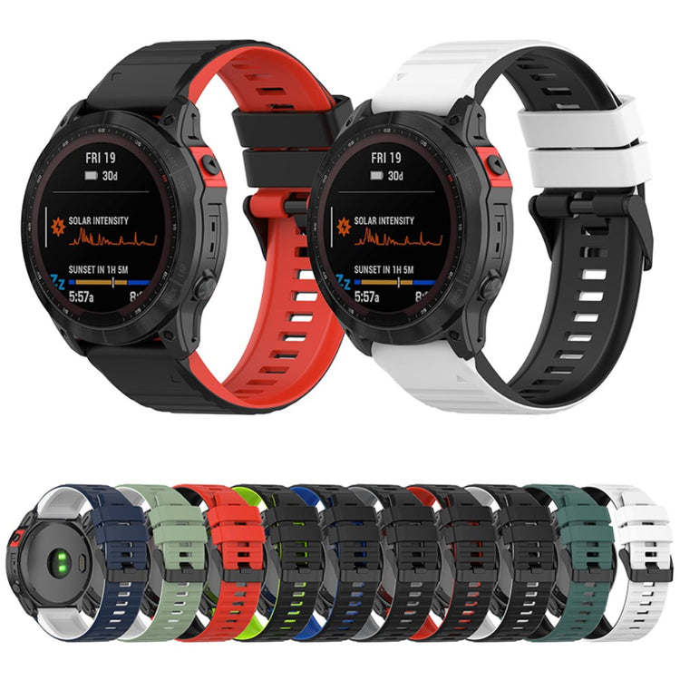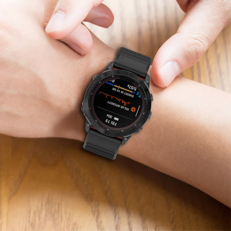 Entscheiden Sie sich für dieses hochwertige Ersatzarmband für Ihre Garmin Fenix 7X/6X/5X und profitieren Sie von zahlreichen Vorteilen! Hergestellt aus umweltfreundlichem Silikonmaterial, ist dieses Armband nicht nur wasser- und schweißbeständig, sondern auch äußerst widerstandsfähig gegen Abnutzung. Das elegante Design mit einem klassischen schwarzen Schnallenverschluss sorgt für einen stilvollen Look, der sich mühelos in Ihren Alltag integrieren lässt. Mit einer breiten Auswahl an Farben erfüllt es unterschiedliche Stilbedürfnisse und ermöglicht es Ihnen, Ihr Armband nach Ihrem persönlichen Geschmack auszuwählen. Die einfache Anpassungsgröße und die weiche, bequeme Materialbeschaffenheit gewährleisten einen perfekten Sitz und hohen Tragekomfort. Dieses Armband ist die ideale Wahl, um Ihr altes oder beschädigtes Armband zu ersetzen. Genießen Sie die perfekte Kombination aus Funktionalität und Stil – machen Sie jetzt den Schritt zu einem neuen Armband für Ihre Garmin Uhr!
