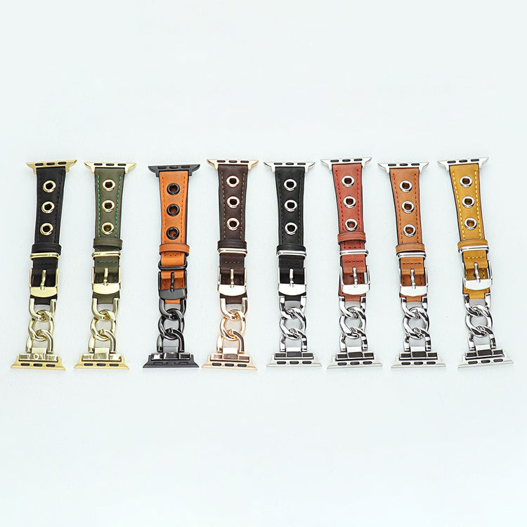 Dieses Armband für die Apple Watch Series 9 / 8 / 7 41mm / 6 / 5 / 4 / SE / SE (2022) / SE (2023) 40mm / 3 2 1 38mm besteht aus hochwertigem Echtleder und ist angenehm zu tragen. Das modische Ketten-Design mit drei großen Löchern sorgt für einen stilvollen Look, während die Pin-Schließe mit Mehrloch-Design eine bequeme Längenanpassung ermöglicht. Es ist der ideale Ersatz für Ihr defektes Armband und perfekt für den täglichen Gebrauch und zum Kombinieren mit Ihrem Outfit.
