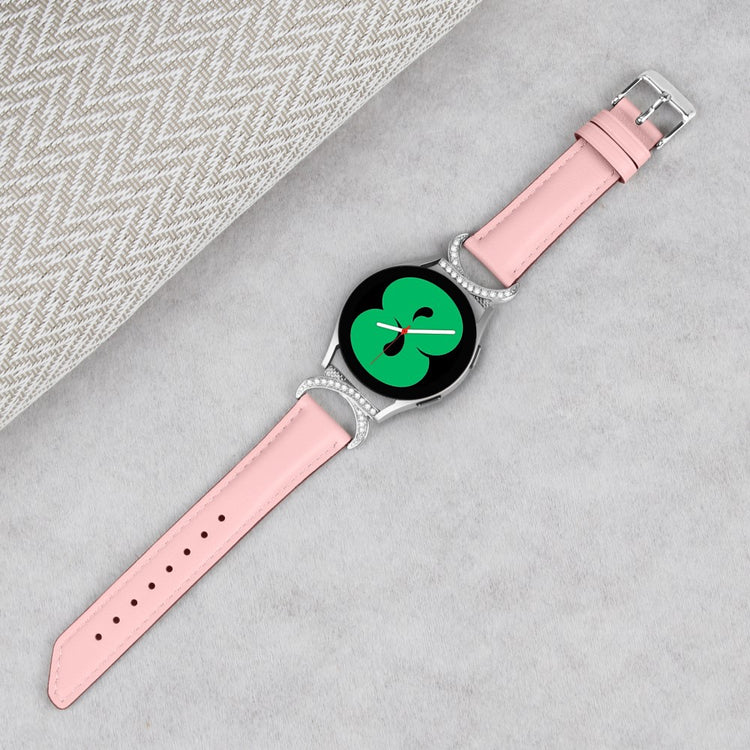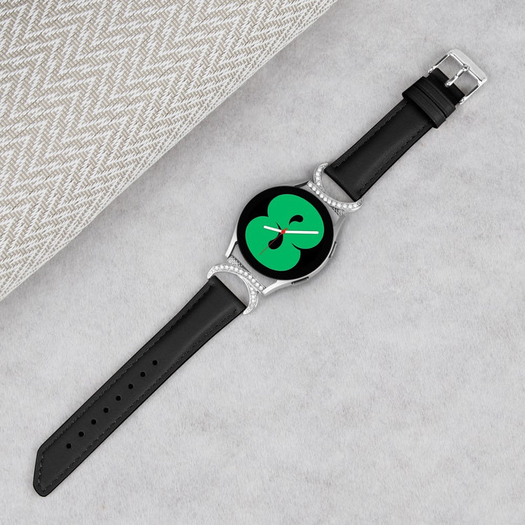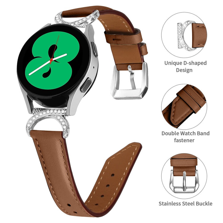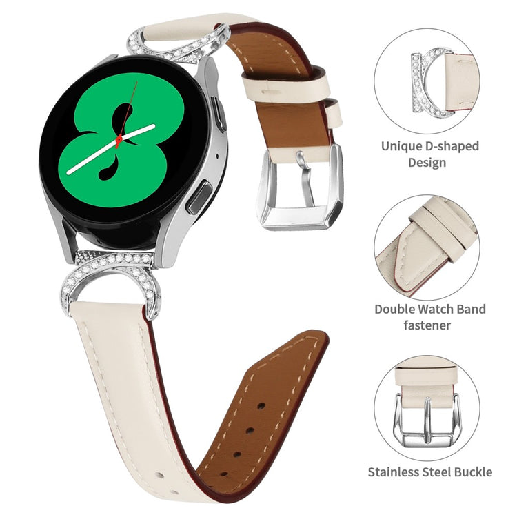 Entscheiden Sie sich für dieses hochwertige Ersatzarmband für Ihre Samsung Galaxy Watch 3 (41mm) oder Watch 5 (40mm/44mm) und verleihen Sie Ihrer Uhr ein neues, elegantes Aussehen. Hergestellt aus Spaltleder mit exquisite Verarbeitung, ist dieses Armband nicht nur weich und bequem, sondern verspricht auch eine hohe Langlebigkeit. Der besondere Rhinestone-Schmuck verleiht dem Armband einen stilvollen Akzent und macht es zu einem echten Blickfang. Dank des D-förmigen Metall-Connectors ist es besonders schick und passt perfekt zu jedem Outfit. Das Armband verfügt über eine Edelstahl-Schließe und ein durchdachtes Design mit mehreren Löchern, wodurch die Anpassung der Größe mühelos gelingt. Zusätzlich sorgt der schräg gestellte Armband-Ende für eine noch attraktivere Optik. Ideal als Ersatz für Ihr altes, beschädigtes Armband, passt es auch zu anderen Uhren mit 20mm Anschluss. Gönnen Sie sich den Luxus, die Betriebsart Ihres Handgelenks zu verändern und bestellen Sie noch heute!