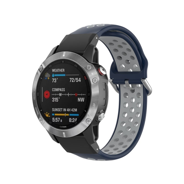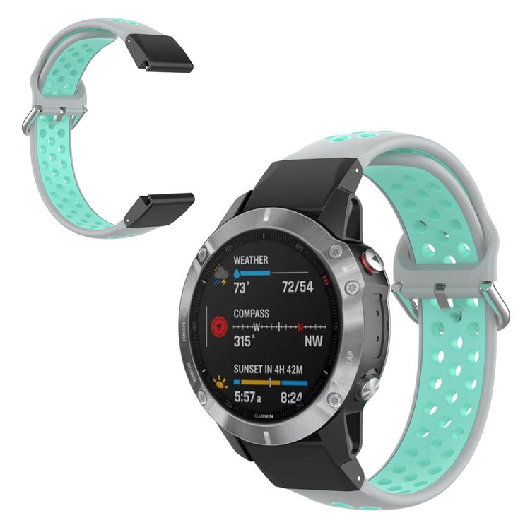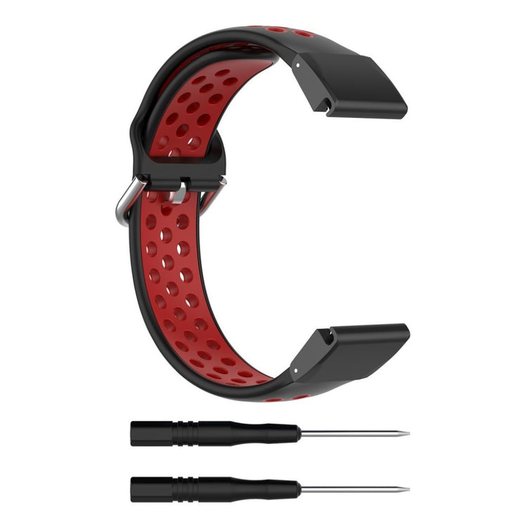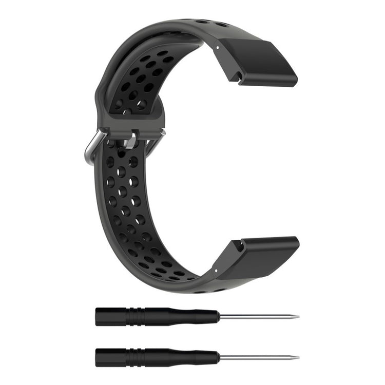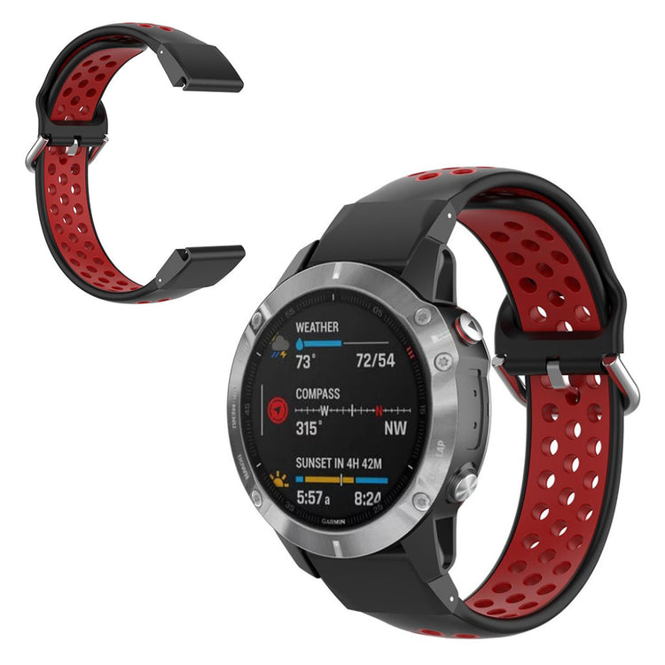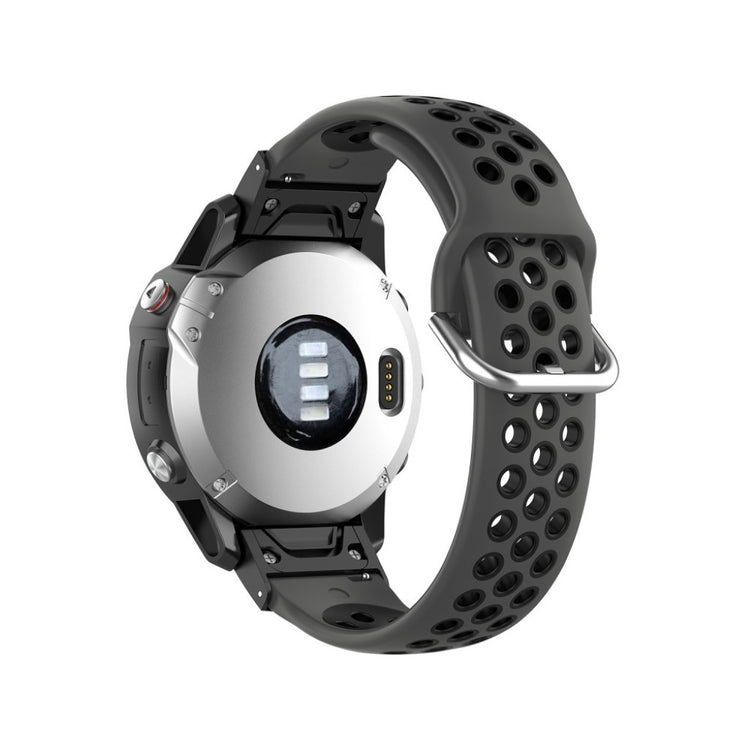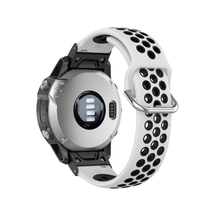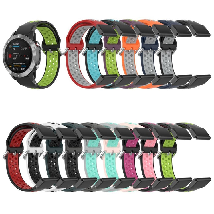 Dieses zweifarbige Uhrenarmband verleiht Ihrer Garmin Fenix Smartwatch einen modernen Look. Das weiche Silikonmaterial mit Luftlöchern sorgt für eine schnelle Wärmeableitung und ein angenehmes Tragegefühl. Das Armband ist sicher, hautfreundlich und passt sich dank der vielen Verstellmöglichkeiten perfekt an Ihr Handgelenk an.