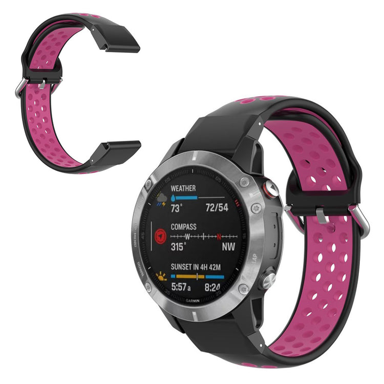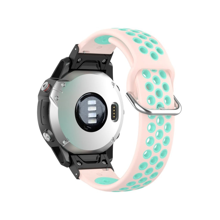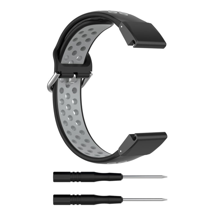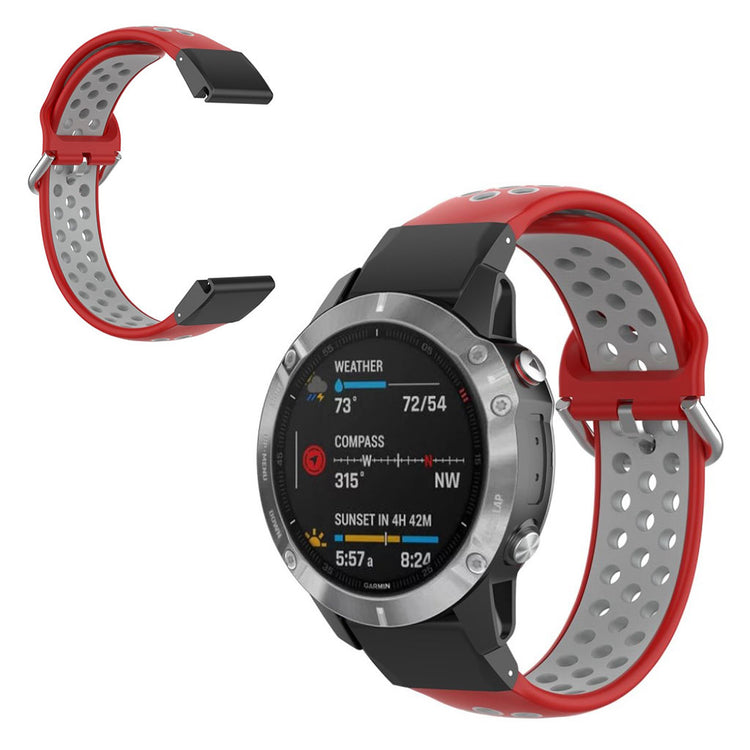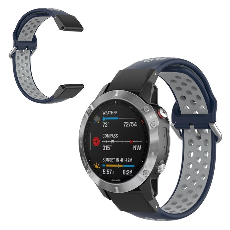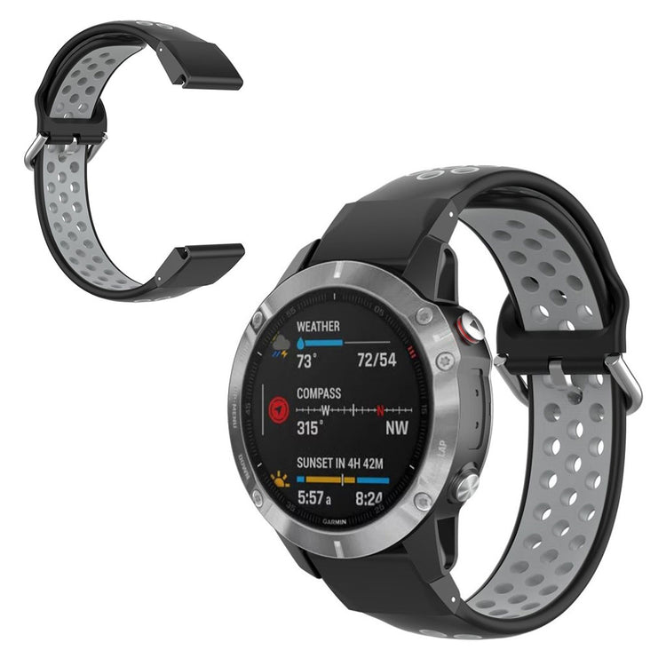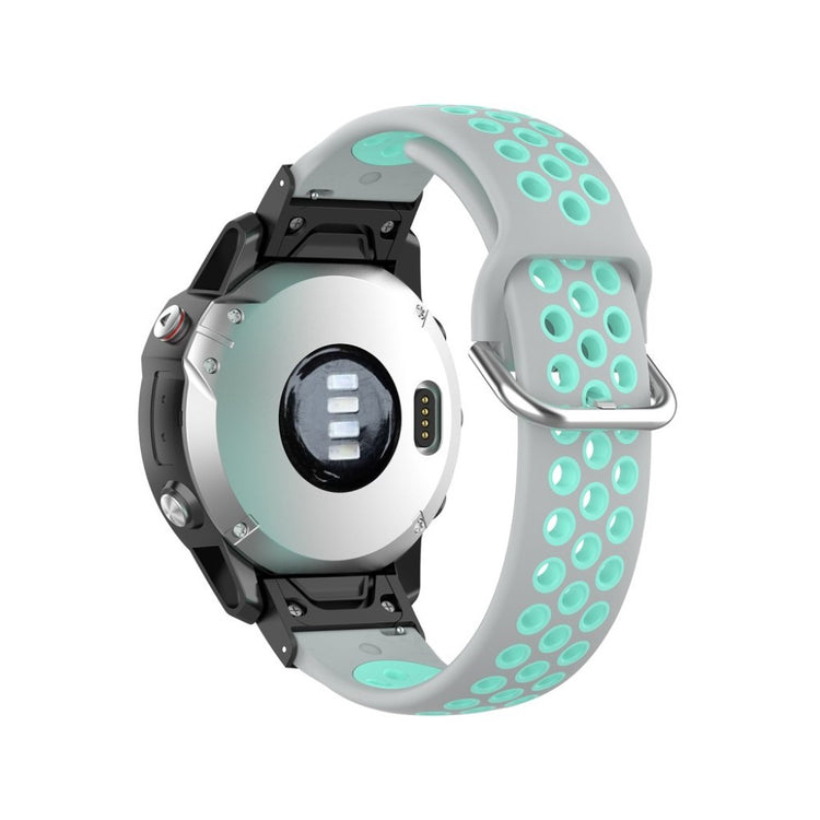 Dieses zweifarbige Uhrenarmband verleiht Ihrer Garmin Fenix Smartwatch einen modernen Look. Das weiche Silikonmaterial mit Luftlöchern sorgt für eine schnelle Wärmeableitung und ein angenehmes Tragegefühl. Das Armband ist sicher, hautfreundlich und passt sich dank der vielen Verstellmöglichkeiten perfekt an Ihr Handgelenk an.