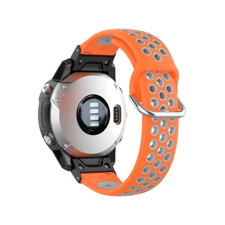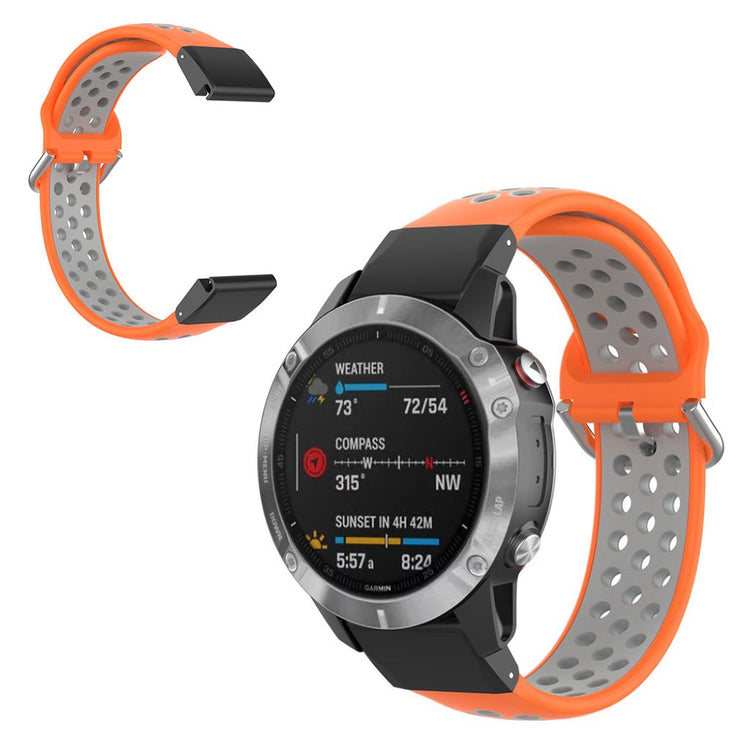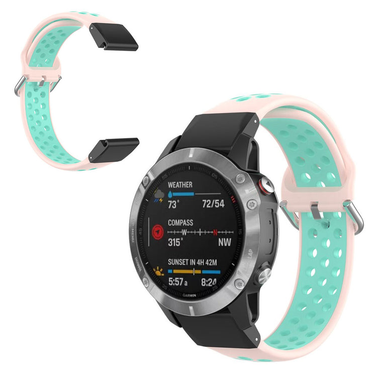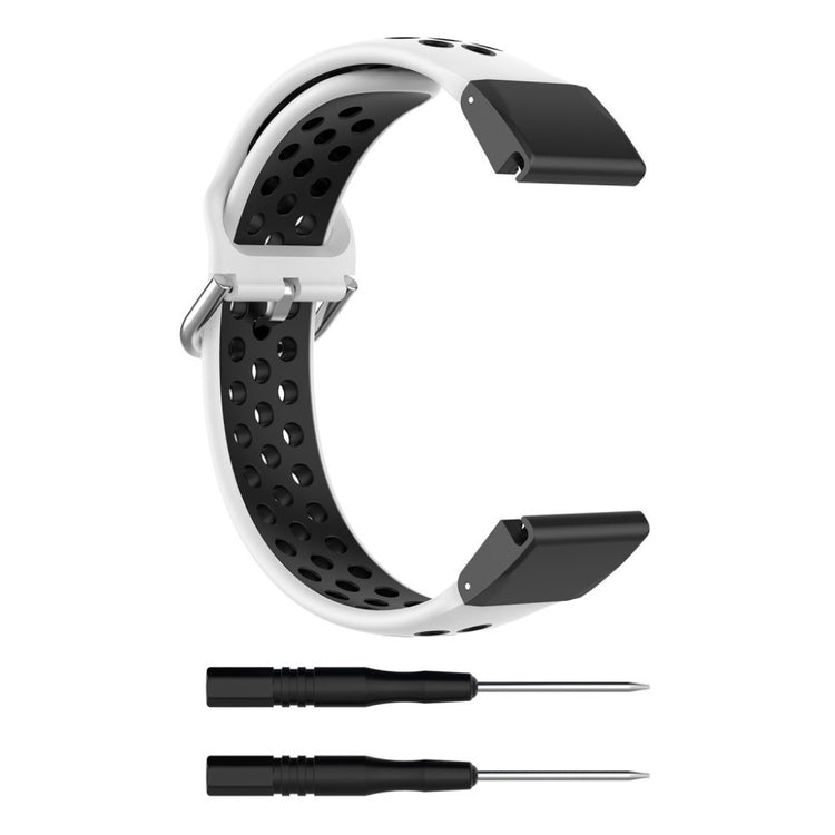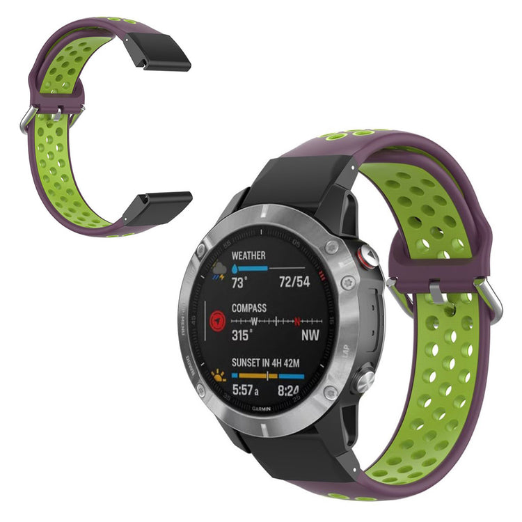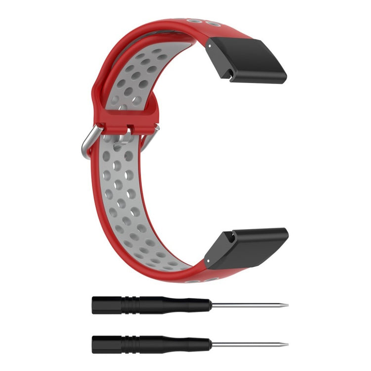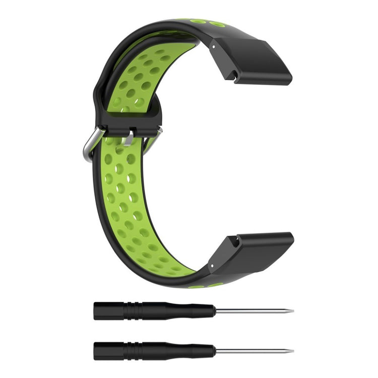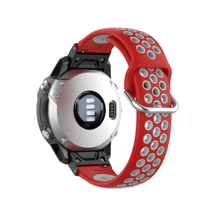 Dieses zweifarbige Uhrenarmband verleiht Ihrer Garmin Fenix Smartwatch einen modernen Look. Das weiche Silikonmaterial mit Luftlöchern sorgt für eine schnelle Wärmeableitung und ein angenehmes Tragegefühl. Das Armband ist sicher, hautfreundlich und passt sich dank der vielen Verstellmöglichkeiten perfekt an Ihr Handgelenk an.